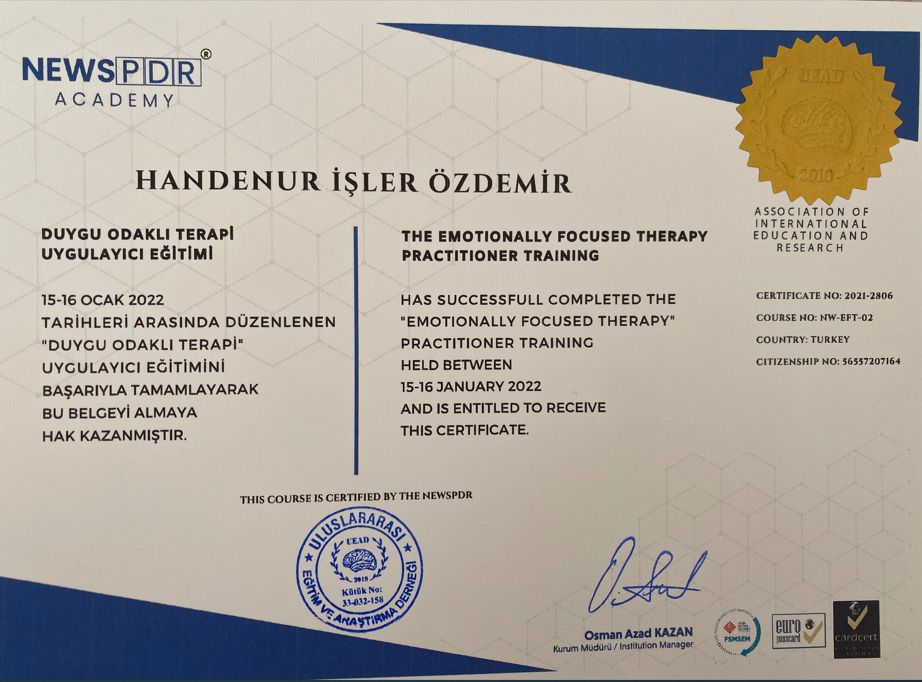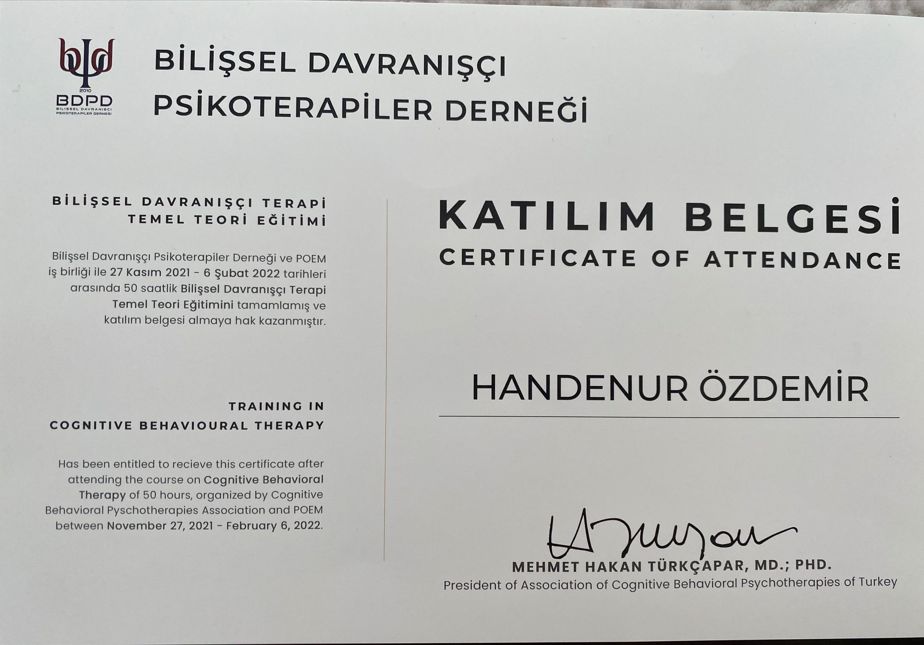 İstanbul doğumlu Handenur Özdemir, İstanbul Sabahattin Zaim Üniversitesi’nde Psikolojik Danışmanlık ve Rehberlik (%30 İngilizce) bölümünü yüksek onur derecesi ile bitirmiştir. Üniversite yıllarında anaokulu, disleksi merkezi ve psikolojik danışma merkezlerinde staj yapmıştır. Mezun olduktan sonra, bir süre anaokullarında okul öncesi seviyesine psikolojik danışmanlık hizmeti vermiştir ardından bir yıl kadar özel bir kolejde psikolojik danışman olarak çalışmıştır.2024 ylıında İstanbul Arel Üniversitesi’nde Klinik Psikoloji Yüksek Lisans eğitimini tamamlamıştır. Yüksek lisansta yaptığı çalışmanın ismi: ‘‘ Şema Terapi Modeli Çerçevesinde Sosyal Kaygı Bozukluğunun İncelenmesi’’ dir. Bilişsel Davranışçı Terapi’ nin önde gelen isimlerinden Hakan Türkçapar, Kadir Özdel gibi isimlerle çalışarak BDT eğitimlerini, Dr. Çiğdem Dürüst’ten Duygu Odaklı Terapi Eğitimi almıştır. Arel Üniversitesi bünyesinde ise Şema Terapi eğitimlerini tamamlamıştır. Günümüzde ise depresyon, panik bozukluk, anksiyete(kaygı) bozuklukları, fobiler, yas süreci, öfke ve öz saygı problemleri gibi konularda online hizmet vermektedir.